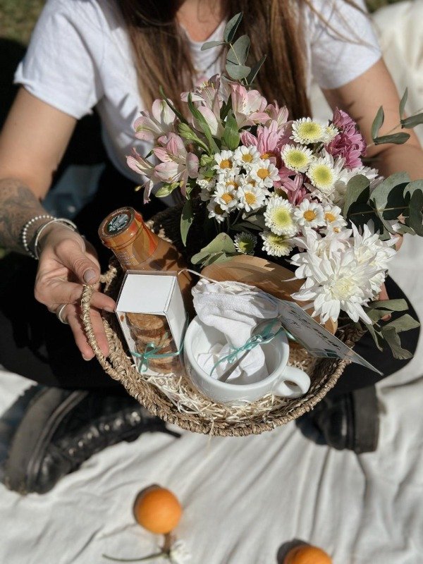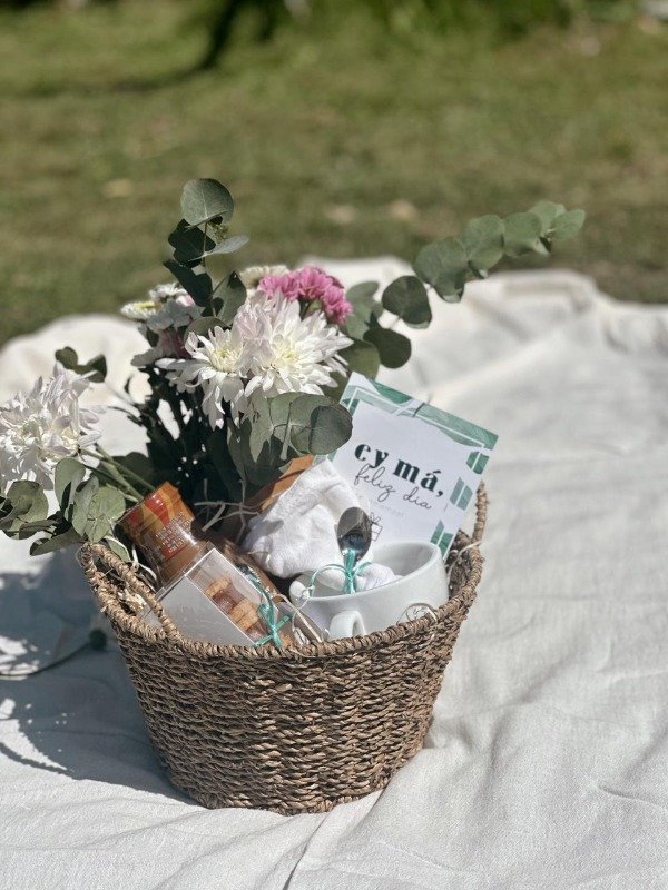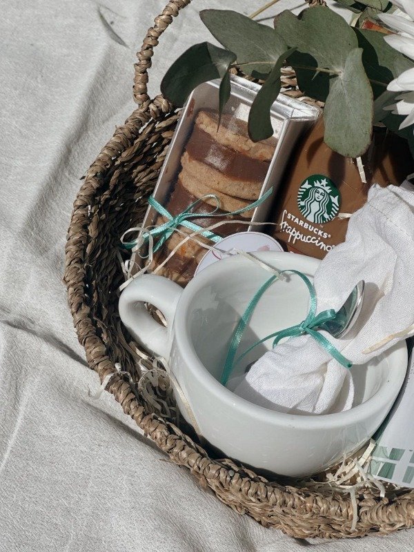 Nuestra Bonita Box fue pensada para celebrar a mamá con todo eso que la hace sonreír: una canasta con flores naturales, café frappuccino, tres alfajorcitos de nuez y una taza con platito de bambú, cucharita y servilleta.