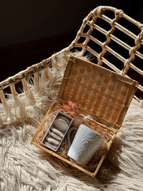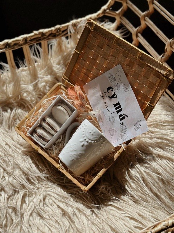 Nuestra Dulce Box fue pensada como un regalo especial para mamá: una pequeña canastita que incluye una taza artesanal, tres macarons y los característicos detalles HM que hacen la diferencia como las florcitas secas, tarjetón y una presentación cuidada hasta el último lazo.